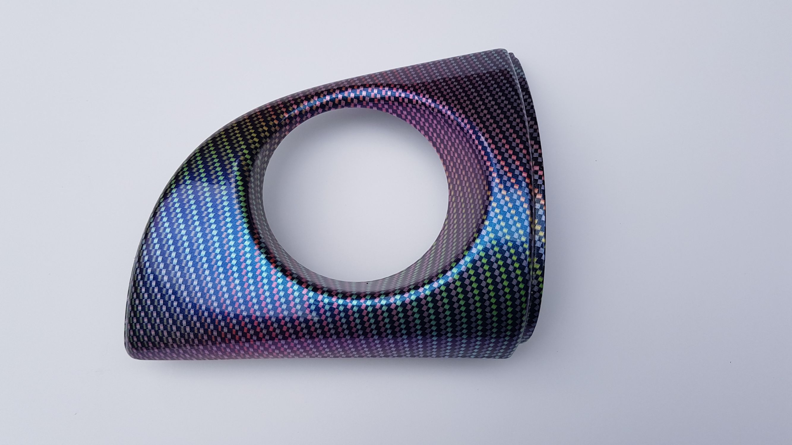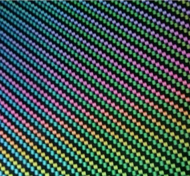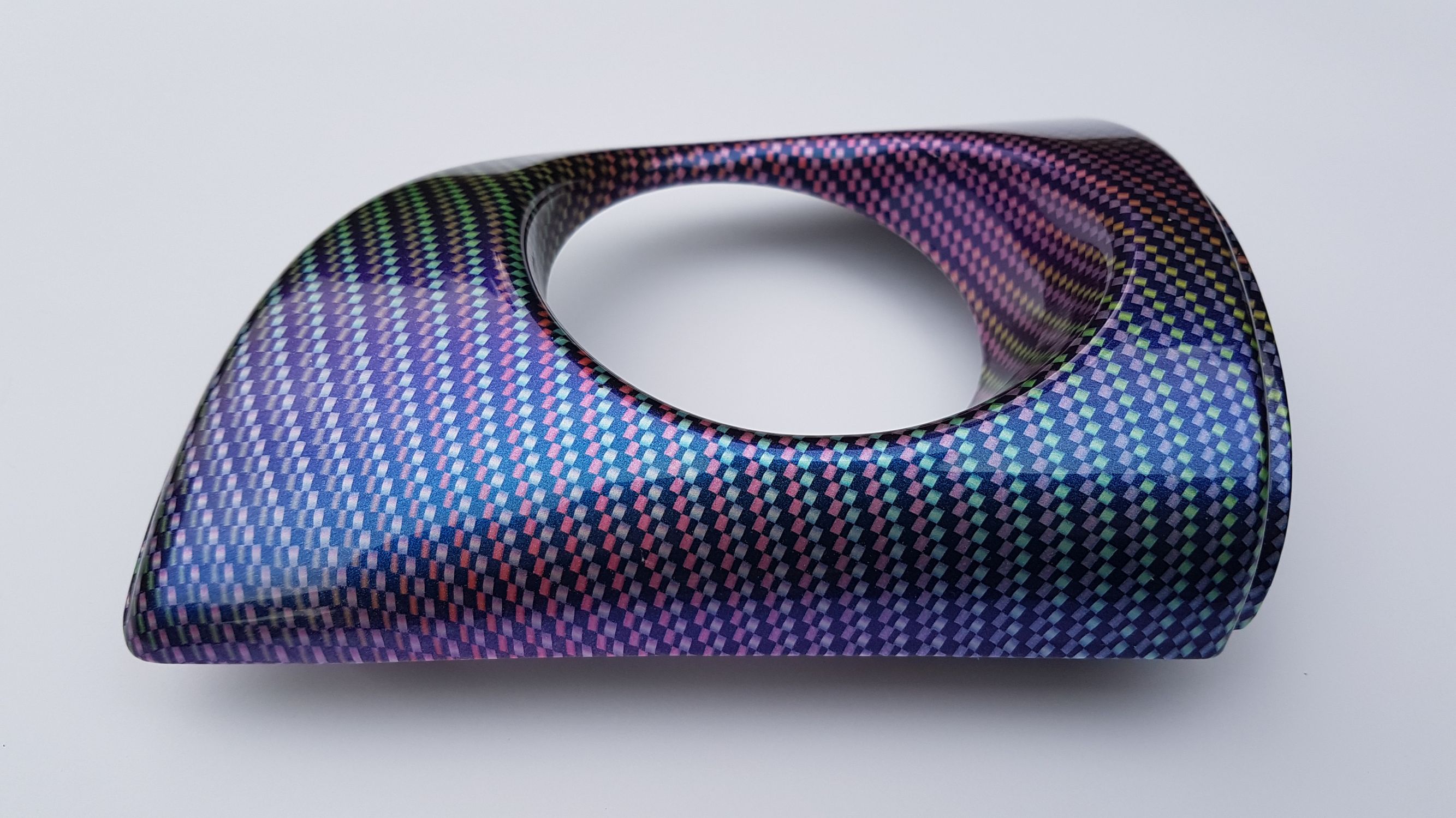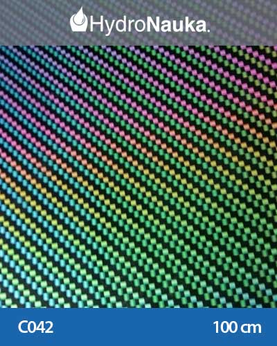 Folia do hydrografiki C042 charakteryzuje się kolorowym nadrukiem o strukturze carbonu. Folia nie jest transparentna. Tego rodzaju barwny, zmieniający się  carbon przypomina nieco kameleona. Zaskakujące kolory folii przykuwają wzrok. Barwność carbonu sprawia, że różni się on od tradycyjnych carbonów spotykanych zwłaszcza w motoryzacji. Ten typ folii do hydrografiki świetnie będzie wyglądał zarówno na rowerze, jak i elementach wnętrza auta. Ozdobi niejeden gadżet. Sprawdzi się na takich materiałach jak ceramika, szkło, plastik czy metal.