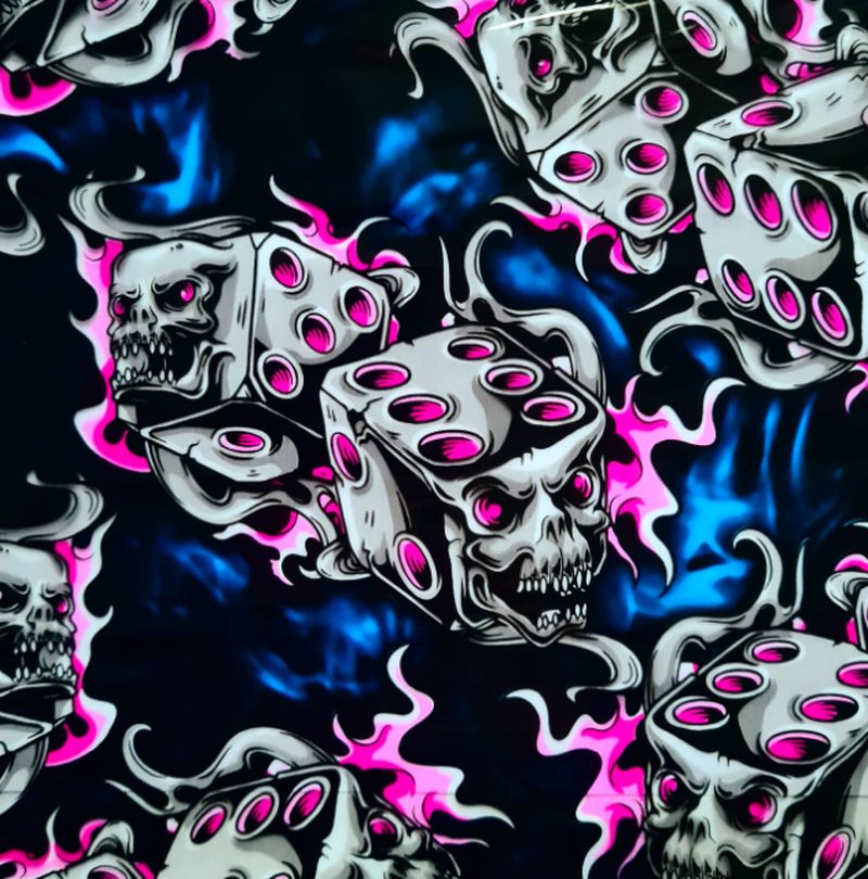 Folia do hydrografiki GC030 - folia z motywem kostek do gry i czaszek, to idealna propozycja dla osób, które preferują oryginalne i dynamiczne motywy graficzne. Folia słabo transparentna, zalecane jasne tło.