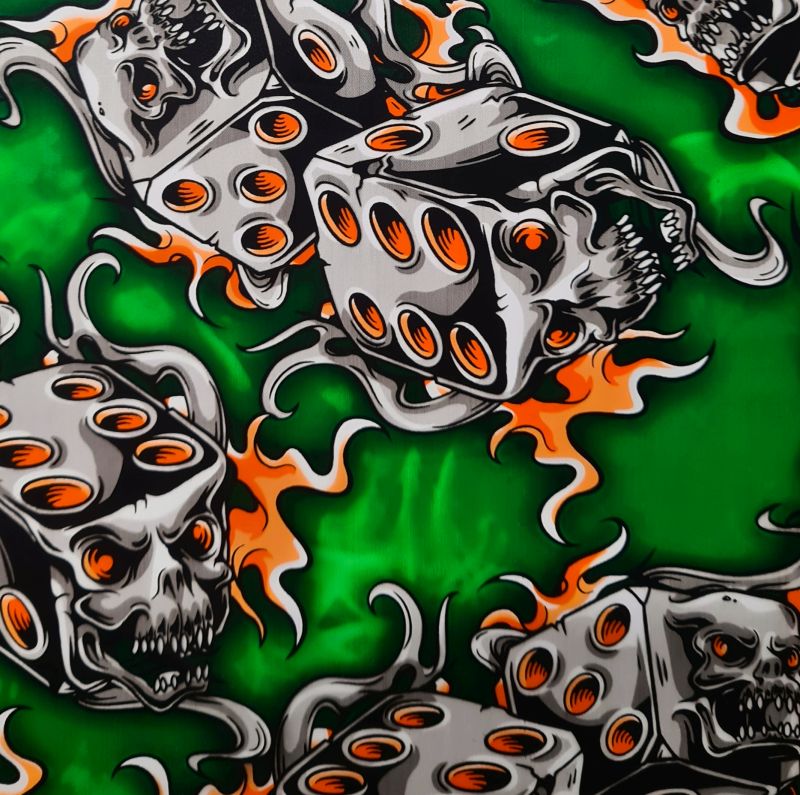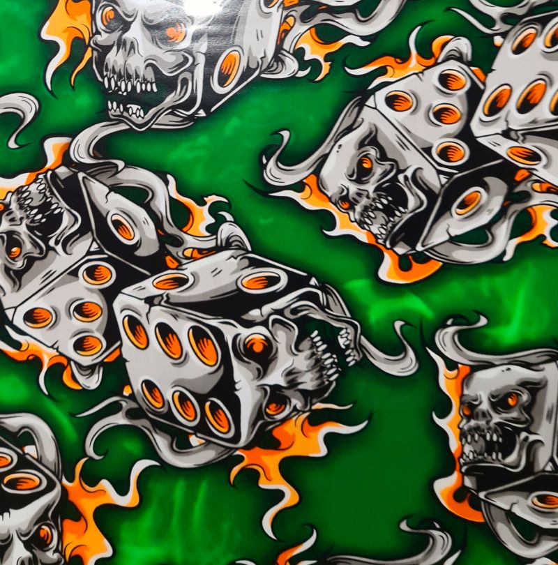 Folia do hydrografiki GC031 - folia z motywem kostek do gry i czaszek, to idealna propozycja dla osób, które preferują oryginalne i dynamiczne motywy graficzne. Folia słabo transparentna, zalecane jasne tło.