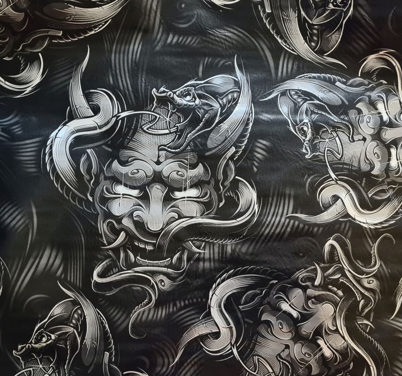 Folia do hydrografiki GML033 - mroczna folia ze srebrnym podbiciem, nieco grubsza od standardowej. Charakteryzuje się szaro-czarnym nadrukiem z motywem diabła. Dla foli nie ma znaczenia kolor tła.